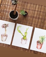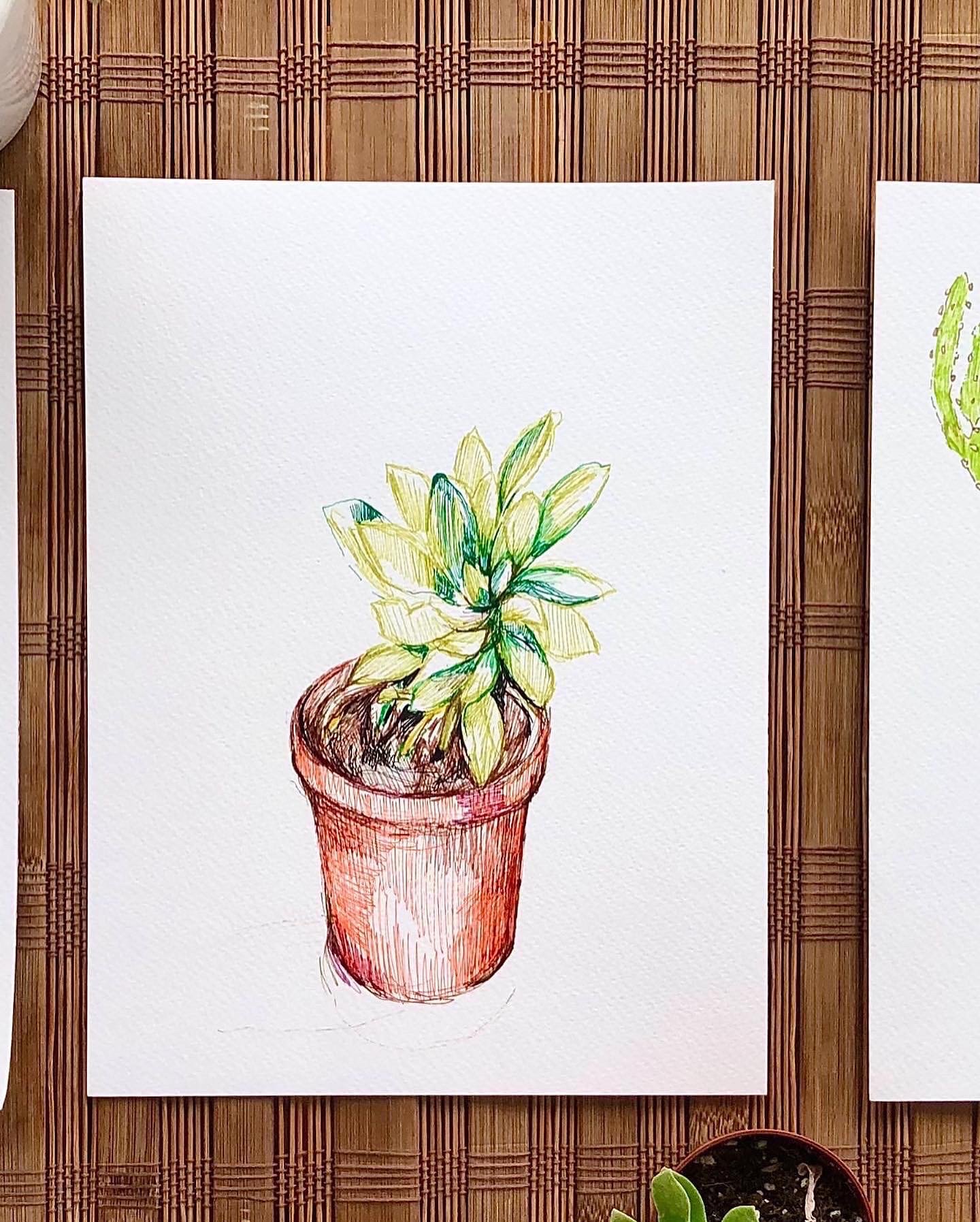 Pen and Ink drawings of 3 potted cacti on fine grain watercolour paper, each 18cmx24cm